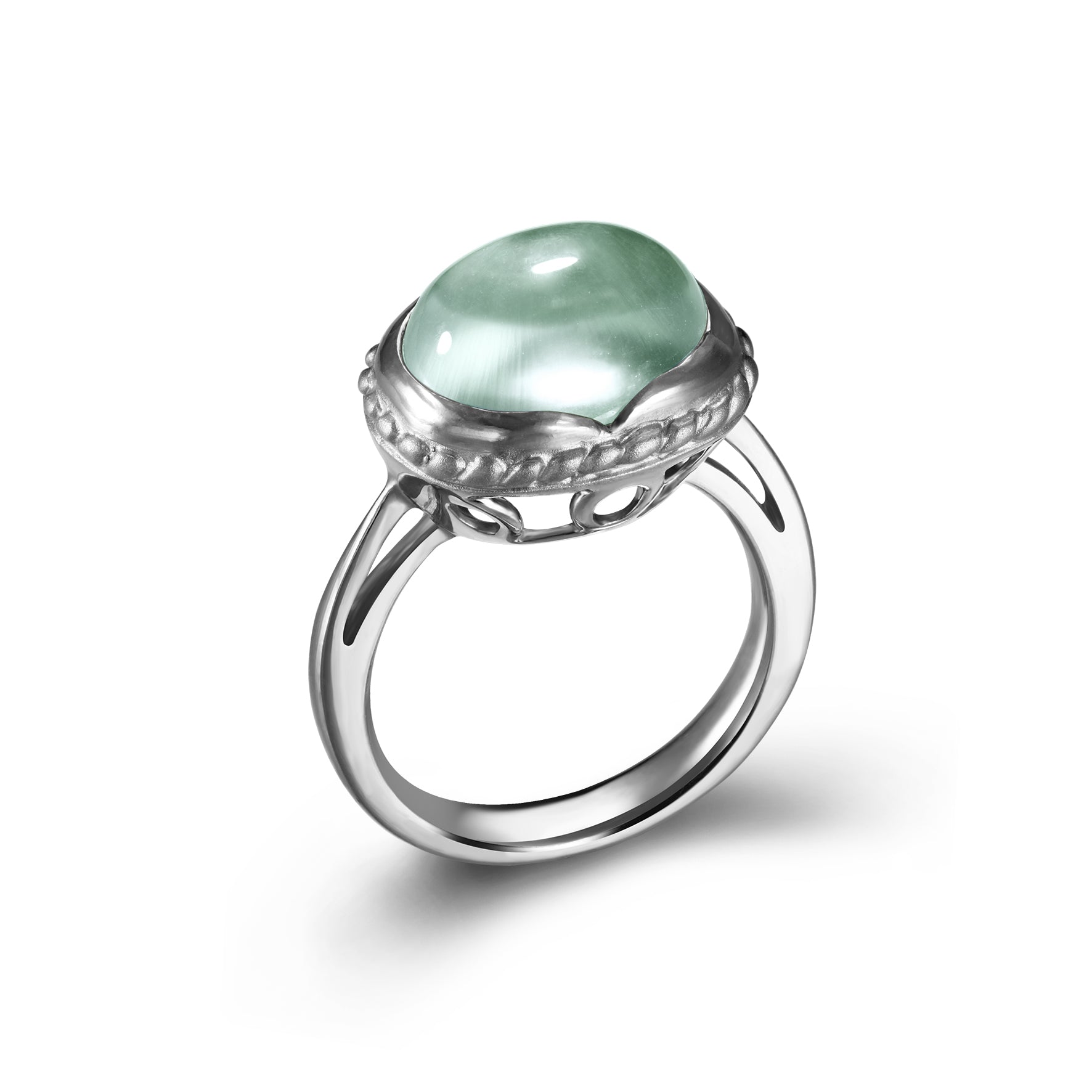 「由古典雕琢的巧手細緻打造而成,中間的寶石如珍貴的心願,四周環繞的麻花更添一份細緻典雅。戒指底部的鑲座宛如雕琢的窗櫺,營造出一種古色古香的美感。將寧靜和優雅凝聚於指尖間。在溫柔的智慧下,擁著恬淡安閒的氛圍。」